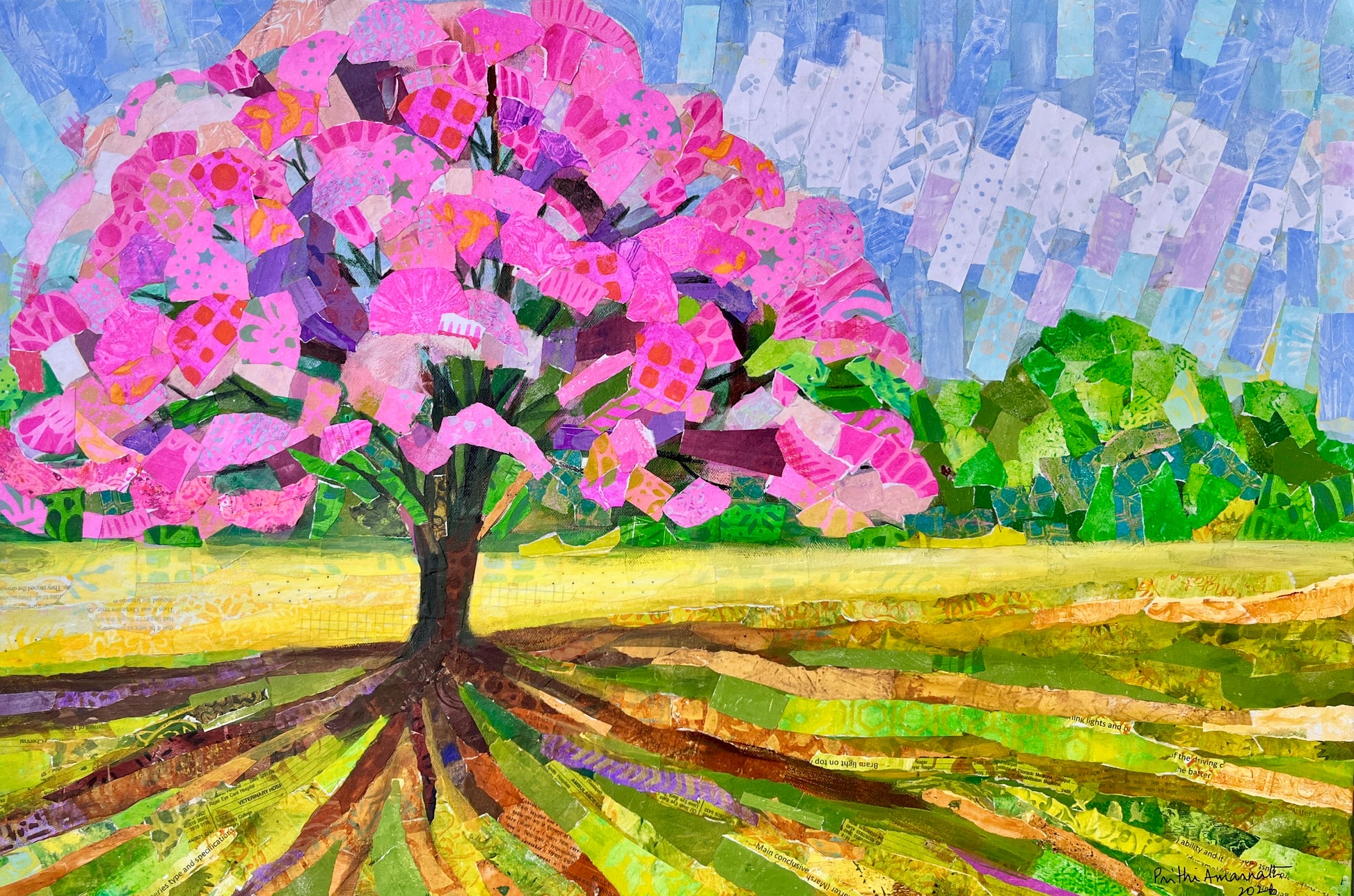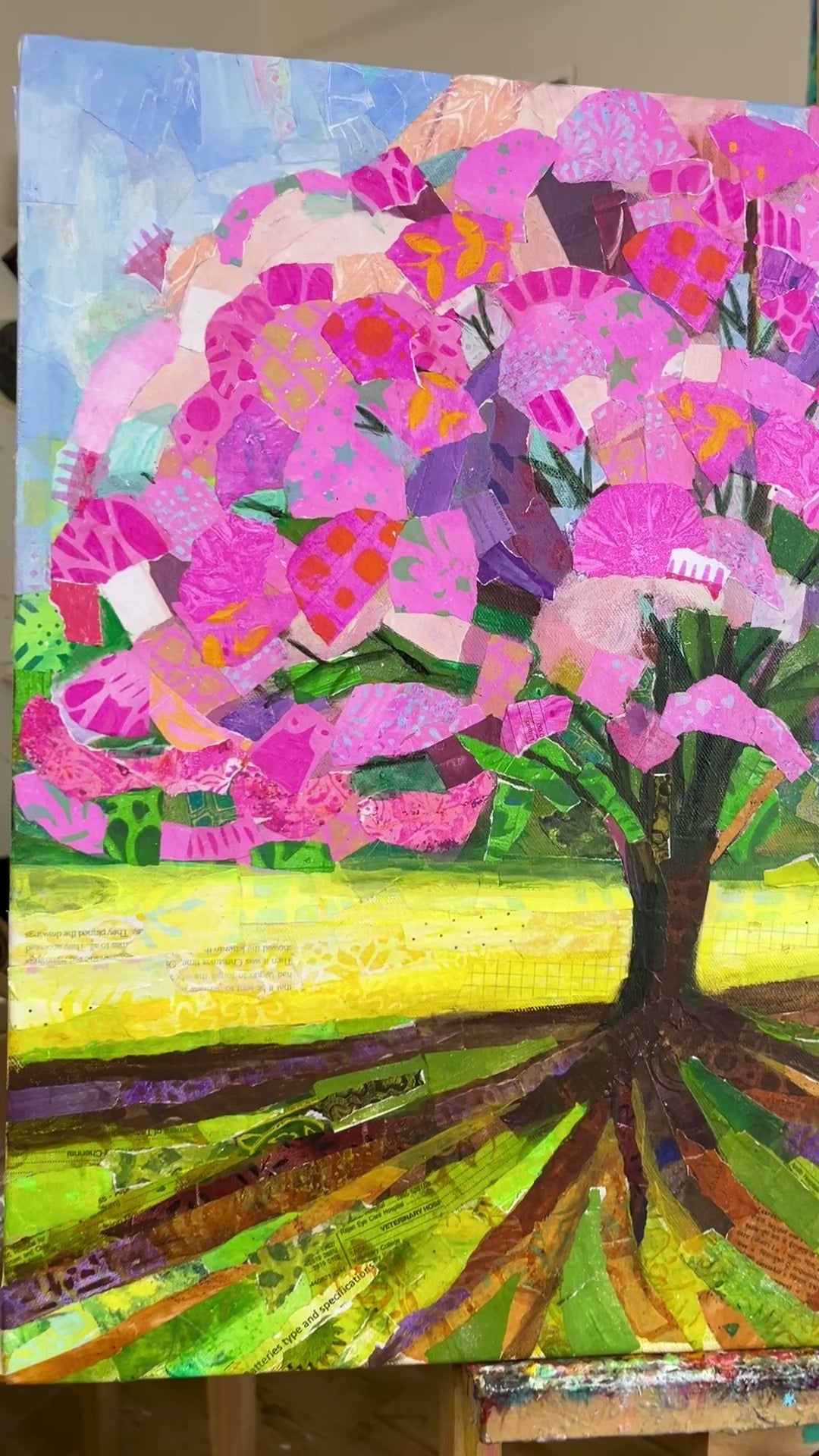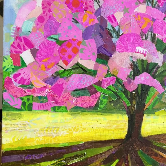 Mixed media collage with hand painted paper on stretched canvas